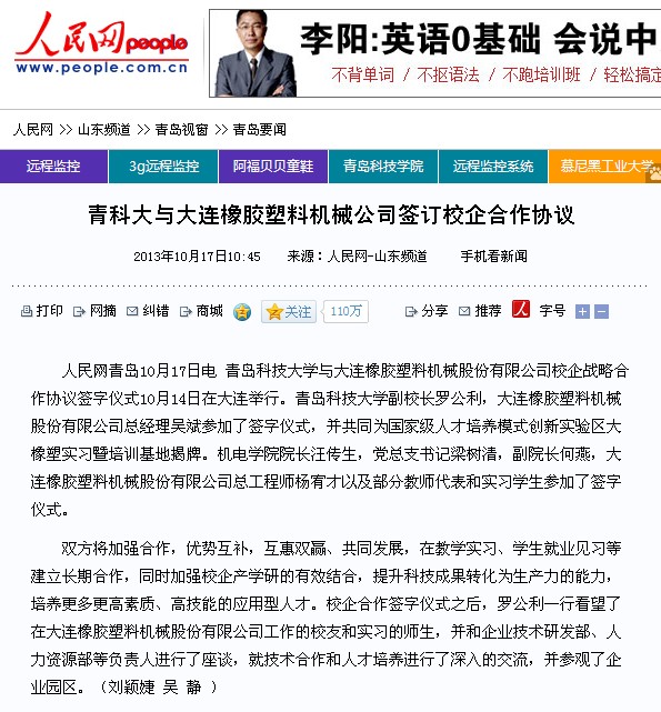 11月14日,探花直播 与大连橡胶塑料机械股份有限公司校企战略合作协议签字仪式在大连举行。