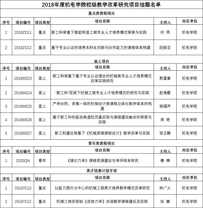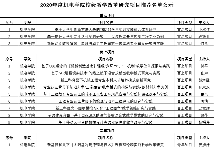 根据学校《关于开展2020年度校级本科教学改革研究项目立项申报暨2018年度校级教改项目结题工作的通知》要求,探花直播 开展了校级教改项目评审工作,经项目负责人申报,学院评审,共通过验收准予结题10项(其中2项暑期提前结题),推荐新立项13项,现将结果公示如下: