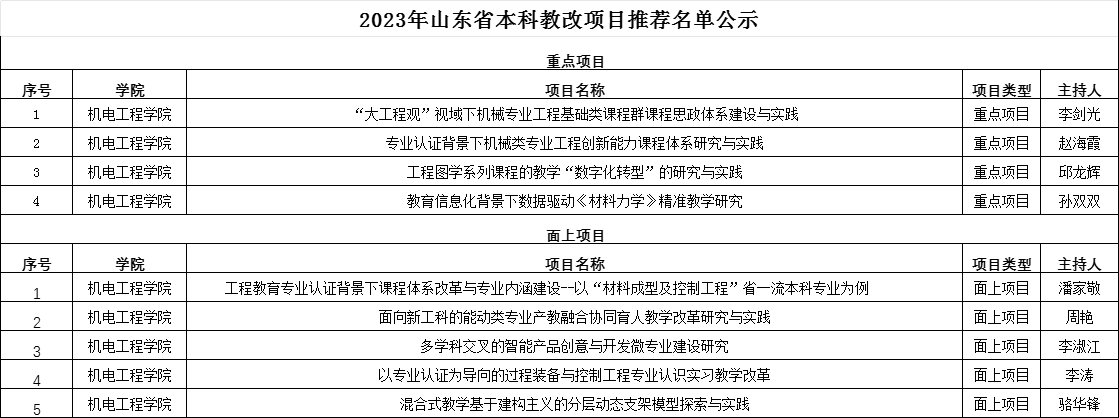 根据学校《关于组织开展2023年山东省本科教学改革研究项目立项申报和管理工作的通知》要求,探花直播 组织开展了省级教改项目申报工作,经项目负责人个人申报,校内专家评审,共拟推荐重点项目4项,面上项目5项,至学校,进行下一步评审。现将结果公示如下:
