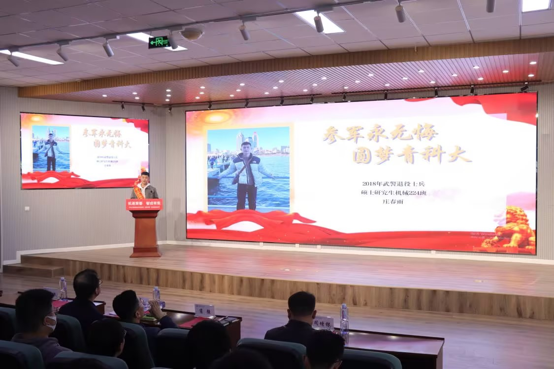 2018年武警退役士兵、硕士研究生机械224班庄春雨,2022年空军退役士兵、成型中韩221班刘易,2022年陆军退役士兵、机械中韩214班梁昊,分别以《参军永无悔,圆梦青科大》《永远跟党走,建功献国防》《参军报国,不负韶华》为题进行了宣讲,从锻炼百折不挠的意志、培养过硬的素质、收获真挚的战友情谊等方面勉励同学们积极投身军营,发挥所学专业知识特长,用青春筑就“强军梦”。