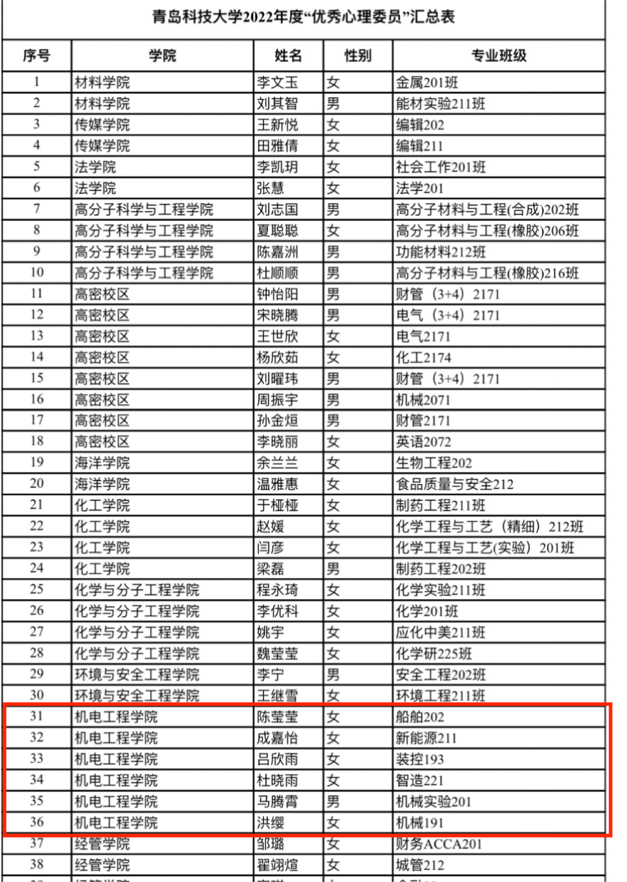 机械191班洪缨、装控193班吕欣雨、机械实验201班马腾霄、船舶202班陈莹莹、新能源211班成嘉怡、智造221班杜晓雨获评“优秀心理委员”。