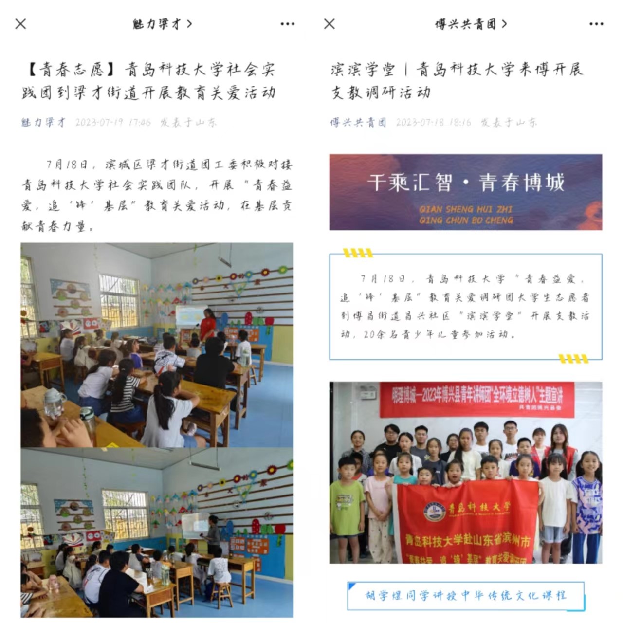 赴滨州市“青春益爱,追‘锋’基层”教育关爱调研团对接滨州市滨城区团区委、博兴县团县委开展大学生乡村教育社会实践,举办了传统文化宣讲,手工制作,智力游戏,科普课堂等特色课程。