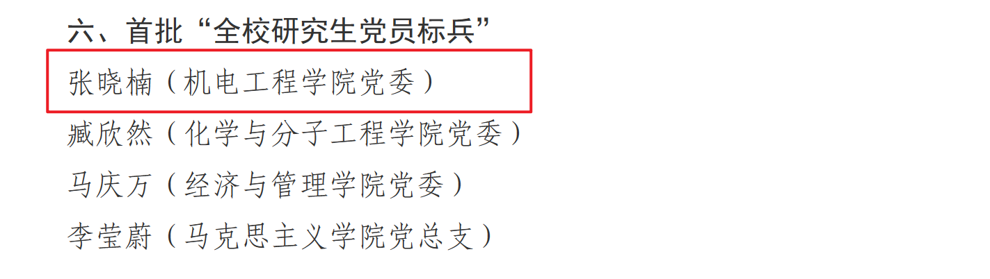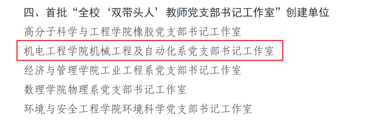党委荣获多项佳绩,其中,学院党委入选首批“全校党建工作标杆院系”创建单位,高分子材料加工机械系党支部入选首批“全校党建工作重点样板支部”创建单位,机械工程及自动化系党支部书记工作室入选首批“全校‘双带头人’教师党支部书记工作室”创建单位,2022级硕士研究生张晓楠入选首批“全校研究生党员标兵”。