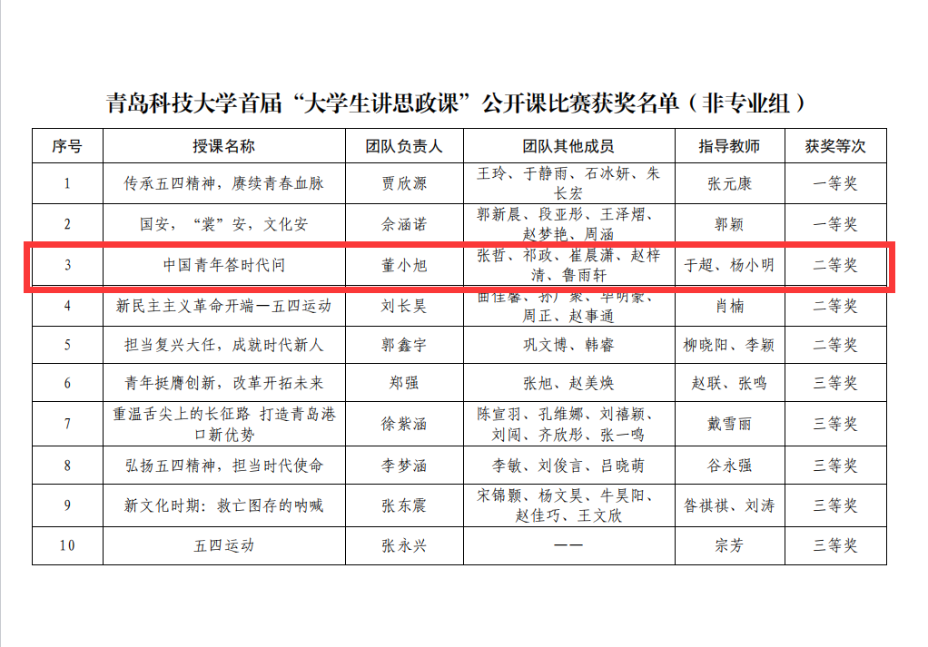参赛作品中,由董小旭、张哲、祈政、崔晨潇、赵梓清、鲁雨轩同学创作的《中国青年答时代问》荣获非专业组二等奖。