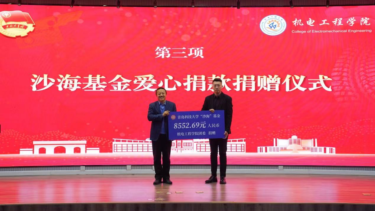 “沙海基金”爱心捐款捐赠仪式环节,由院党委副书记兼副院长杨小明代表学院向校团委副书记李航进行捐赠。探花直播