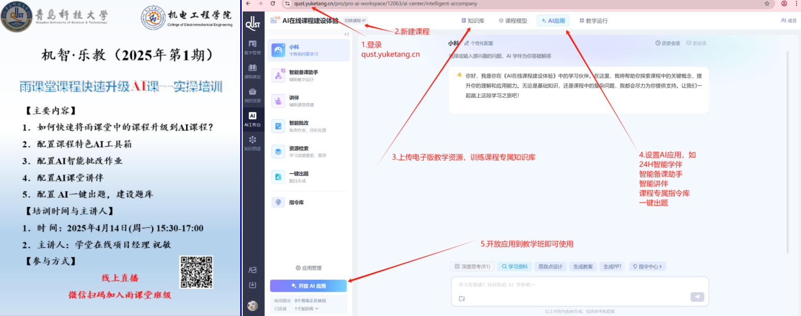 教师的数智意识,助力教师拥抱人工智能,积极探索新环境下的教育教学新模式和技术路径,学院于4月14日开启了“机智·乐教”系列首期培训。本次活动基于学堂在线平台,邀请平台祝经理做了“雨课堂课程快速升级AI课——实操培训”线上报告,为老师们AI课程入门传经送宝,破解教师AI应用难题。