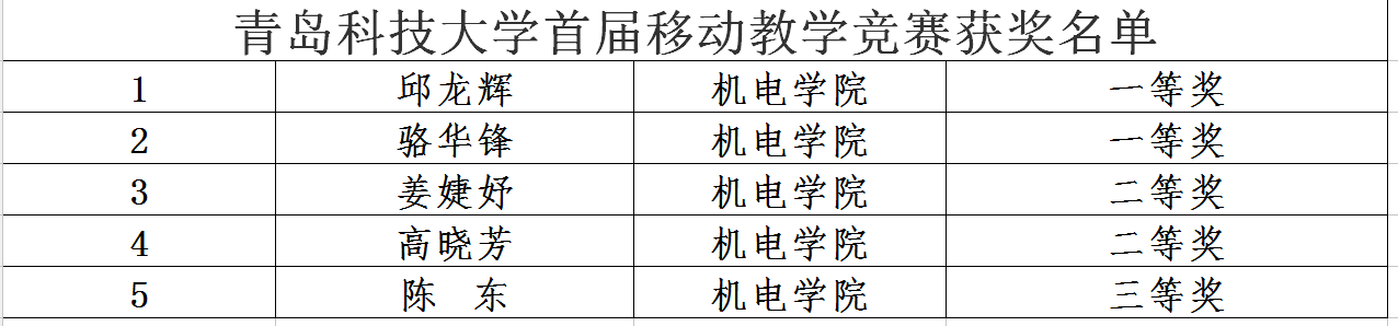 首届移动教学竞赛的通知》,为了推广课程教学信息化建设,提高师生信息化应用水平和信息素养,建设“互联网+教育”课程平台,推动信息化教学从融合应用向创新发展转变,激励教师改革课堂教学模式,学校开展了首届移动教学竞赛评审。综合教学过程实践考核和现场教学表现,共评出获奖教师25名,其中一等奖5名,二等奖9名,三等奖11名,现将获奖名单如下: