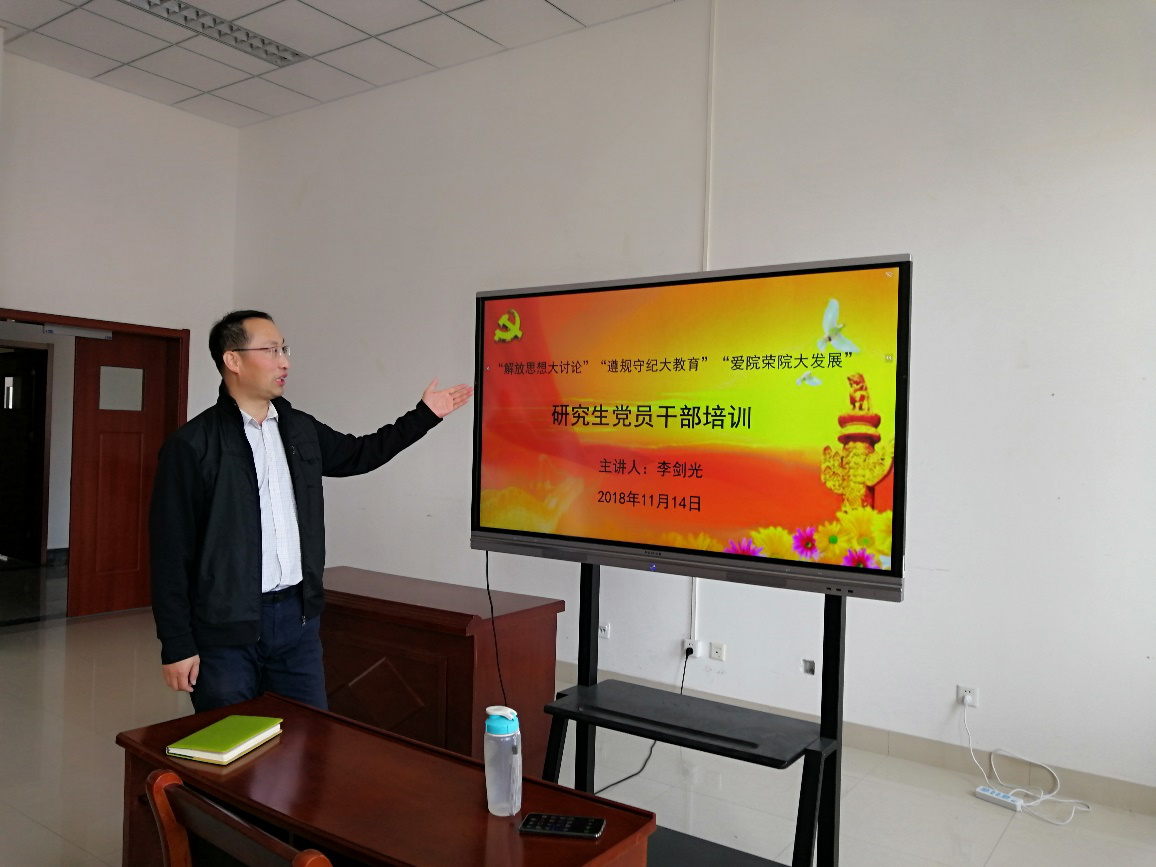 会议中,研究生辅导员李剑光老师就本学期以来学院研究生管理工作结合“解放思想大讨论”“遵规守纪大教育”“爱院荣校大发展”主题开展培训。李老师围绕研究生干部、党员的成长与同学们展开了热烈的讨论,指出了一段时间以来,学生干部群体中出现的思想作风、工作作风、纪律作风问题,督促大家杜绝此类现象的出现,真正做到不忘初心。