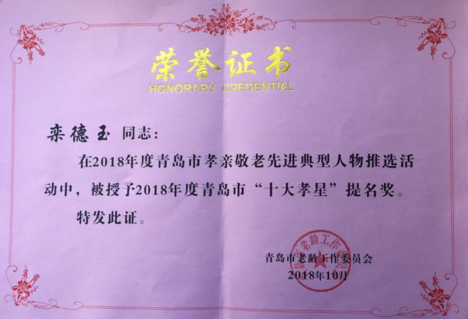 栾德玉老师在2018年度青岛市孝亲敬老先进典型人物推选活动中,被授予2018年度青岛市“十大孝星”提名奖。