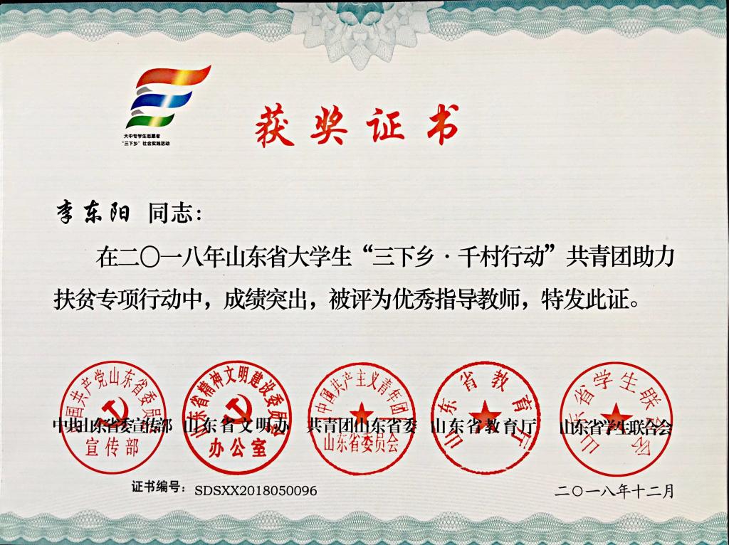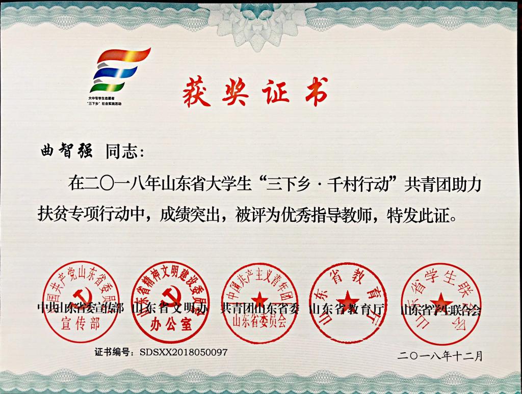 赴丁里长镇张武屯村调研团”获“三下乡·千村行动”共青团助力扶贫专项行动省级优秀服务团队,曲智强、李东阳获 “三下乡·千村行动”共青团助力扶贫专项行动社会实践活动优秀指导教师,王娟娟、苗清获“三下乡”社会实践活动优秀指导教师,毕岚森等多名学生获 “三下乡”社会实践优秀学生。