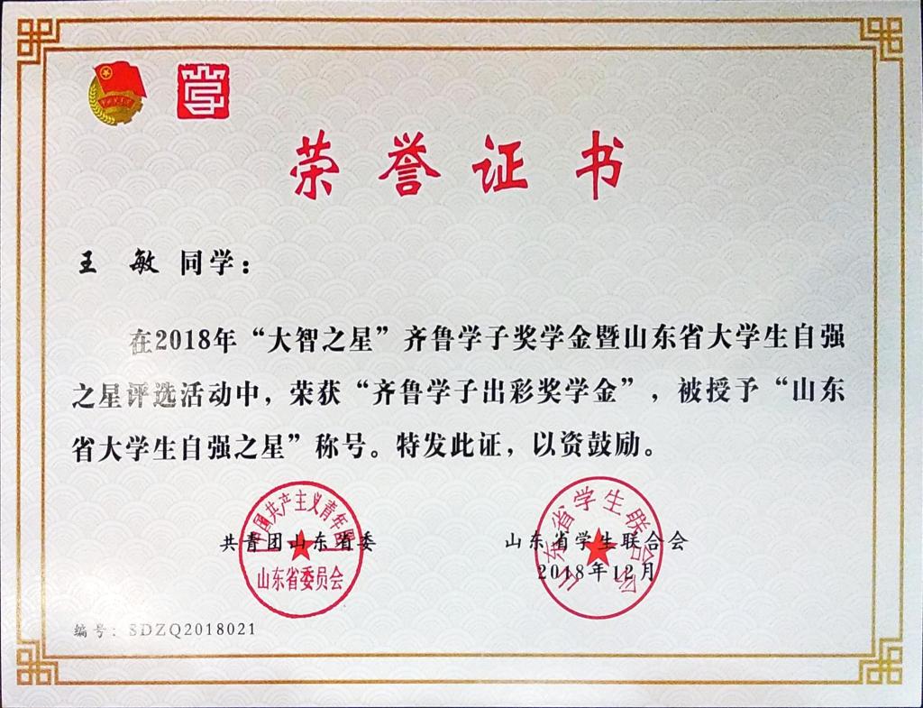 2018年5月,团省委、省学联等单位启动了2018年“大智之星”齐鲁学子奖学金评选活动,旨在深入学习贯彻落实习近平新时代中国特色社会主义思想和党的十九大精神,选树和宣传一批可亲、可敬、可信、可学的优秀青年学生典型,发挥示范引领作用,引导广大青年学生坚定理想信念、练就过硬本领、勇于创新创造、矢志艰苦奋斗、锤炼高尚品格。经校内宣传发动、学生自主报名、各院系推荐、学校评选,省级专家委员会审定,最终产生“山东省大学生自强之星标兵”(授“榜样奖”)10名、“山东省大学生自强之星”(授“出彩奖”)40名和“山东省大学生自强之星提名奖”25名。