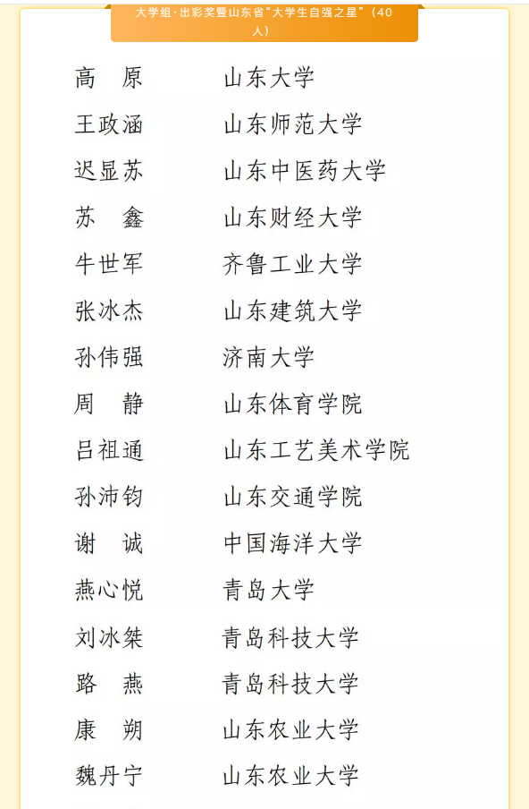学子刘冰桀荣获大学组--出彩奖暨山东省“大学生自强之星”。