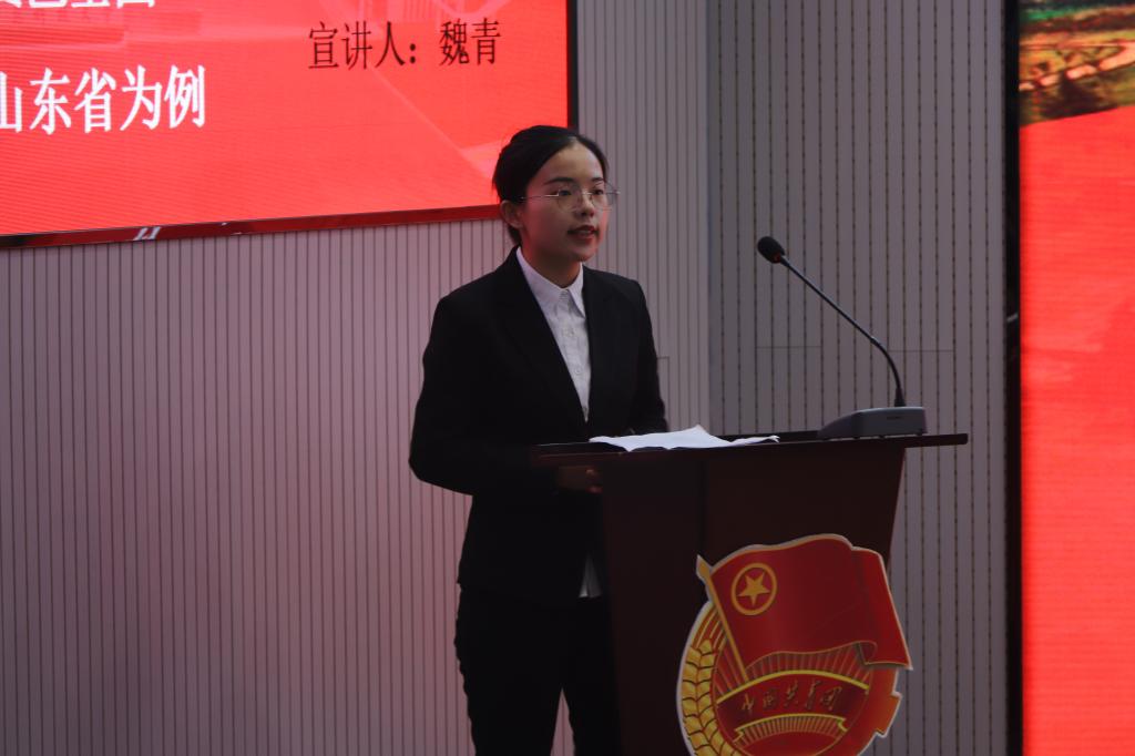 马克思主义学院“习近平新时代中国特色社会主义思想宣讲团”成员魏青和李晶晶分别作了题为《讲好红色故事 传承红色基因》、《五星红旗背后的故事》的理论宣讲。同学们一起赏析观看了《红星照耀中国》。