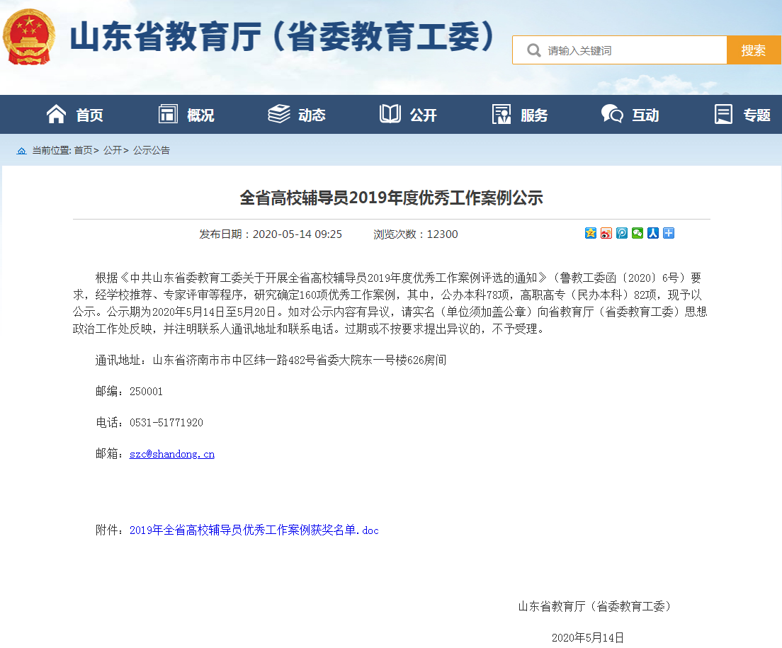 据悉,此次评选是为深入学习贯彻习近平新时代中国特色社会主义思想,全面落实全国、全省教育大会和高校思想政治工作会议精神,切实加强我省高校辅导员队伍专业化、职业化建设,根据《中共山东省委教育工委关于开展全省高校辅导员2019年度优秀工作案例评选的通知》(鲁教工委函〔2020〕6号)要求,经学校推荐、专家评审等程序,最终研究确定160项优秀工作案例。