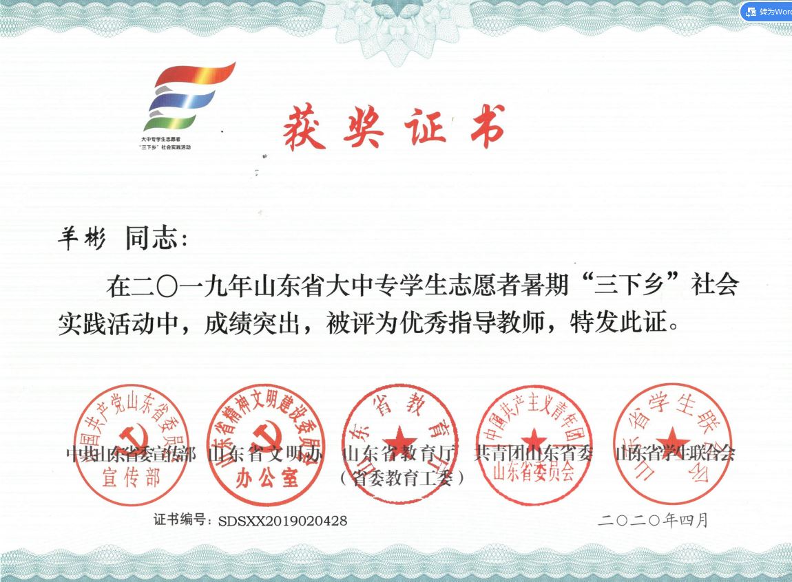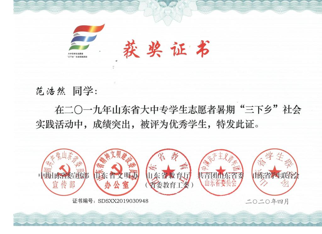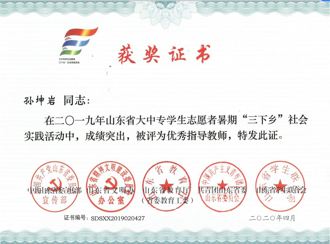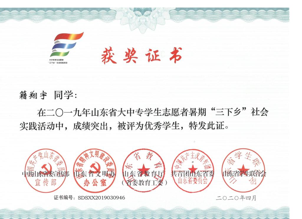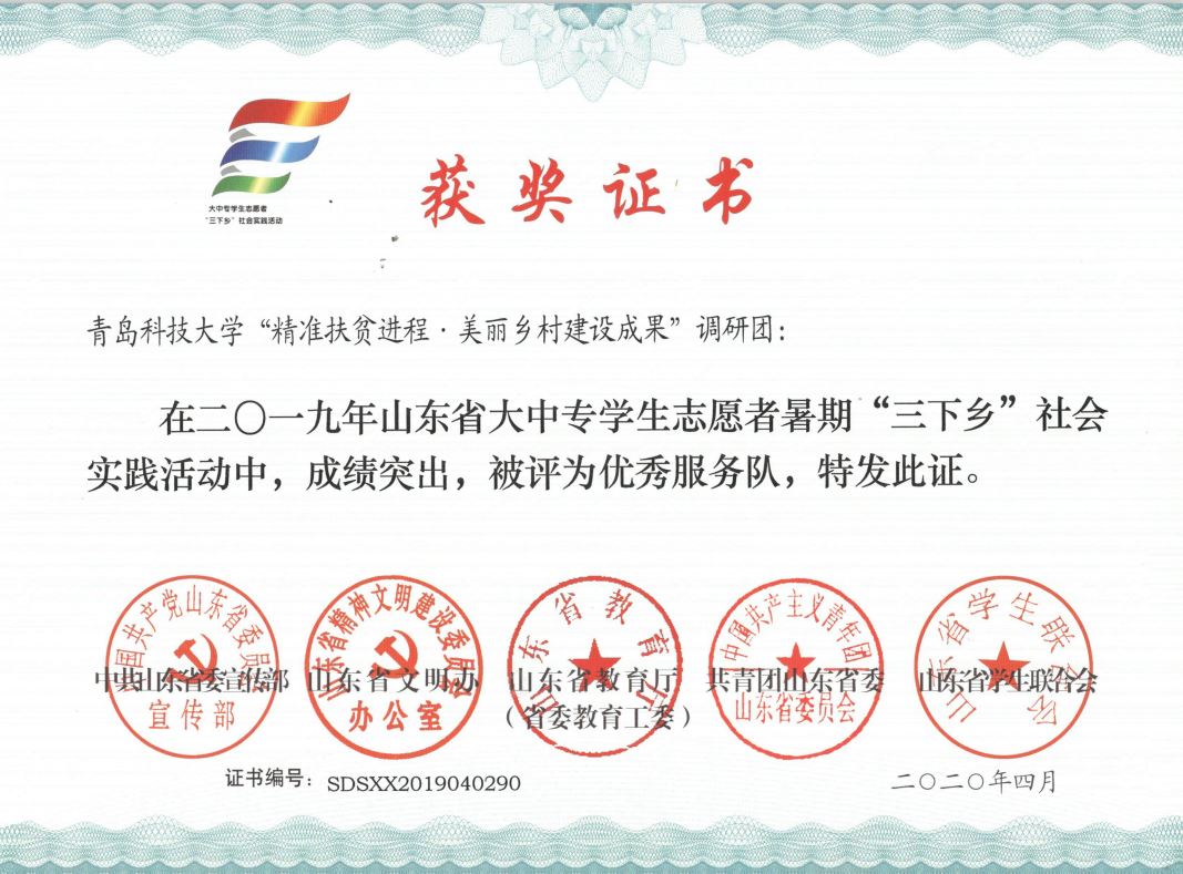 近日,2019年山东省大中专学生志愿者暑期文化科技卫生“三下乡”社会实践活动先进集体和先进个人的证书下发,探花直播 “探花直播 精准扶贫进程 美丽乡村建设成果”调研团、获“三下乡”省级优秀服务团队,孙坤岩、羊彬获“三下乡”社会实践活动优秀指导教师,籍翔宇、张晓楠、范浩然、马晓东获 “三下乡”社会实践优秀学生。