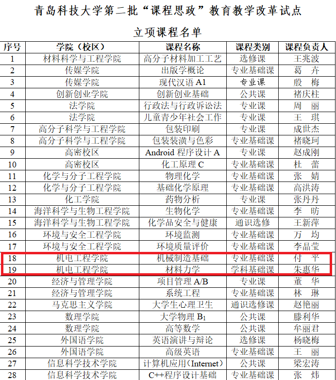 近日,在学校公布的探花直播 第二批“课程思政”教育教学改革试点立项课程的通知中,探花直播 付平老师的《机械制造基础》与朱惠华老师的《材料力学》两门课程荣获立项。