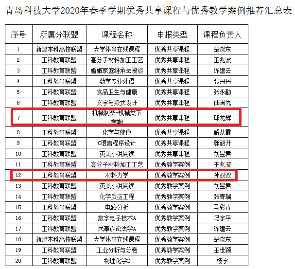近日,在学校公布的2020年春季学期优秀共享课程与优秀教学案例评选结果公示中,学院邱龙辉老师的《机械制图-机械类下学期》获评校优秀共享课程,孙双双老师的《材料力学》获评校优秀教学案例。