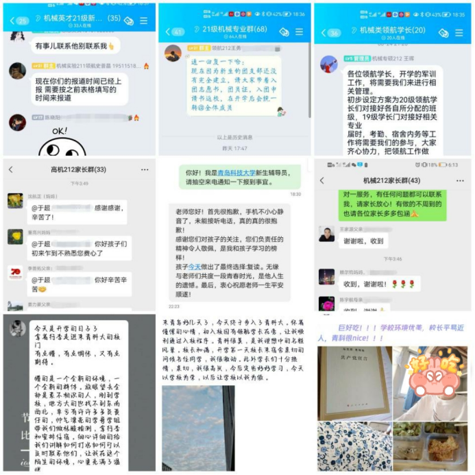 建立2021级官方新生年级群、专业群、班级群,就校园布局,教学楼、食堂、浴室、快递收发点等位置,科大美食,周边景区等进行答疑。提前摸排学生健康码、14天行程轨迹、疫苗接种率、核酸检测证明等信息。建立家长微信群,做好家校共育工作,学生进校后及时了解关注学生动态,做到让家长放心,让学生安心。今天刚到校的新生说:“自从录取结果出来之后,辅导员老师第一时间便与我取得了联系,专业群和班级群中发布了很多有关疫情防控期间返校的温馨提示,老师、学长一一解答。学长老师总是有问必答,给了我们很多学习成长的经验。”更有许多同学在朋友圈空间晒出来自学校无微不至的关怀,老师细心帮助的服务,为学校的疫情防控工作和老师们学长们用“心”服务点赞。
