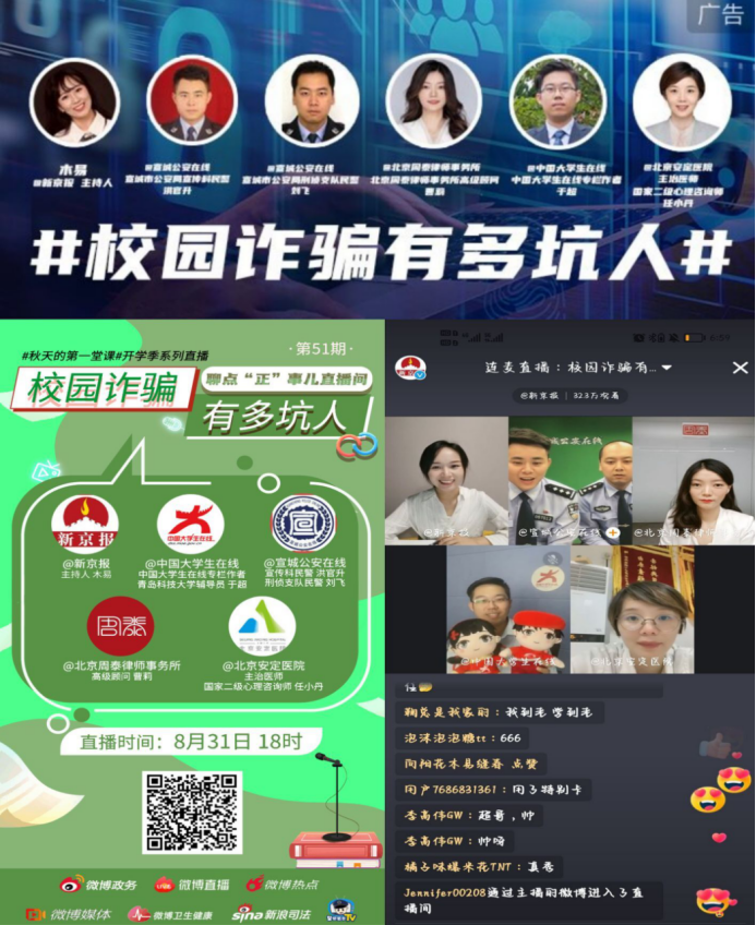 直播中,五位受邀嘉宾深入探讨了诈骗的几种手段,如何引导学生和家长提高防范意识,如何防范校园诈骗?讲解多发诈骗手段和防范知识,从源头上减少电信诈骗案发率,守护好学生钱袋子安全。于超作为受邀嘉宾中的唯一辅导员代表,用诈骗实例对诈骗的现状和防范做了介绍,详细介绍了冒充警察诈骗、冒充熟人诈骗、购物网站刷信誉诈骗、冒充购物网站客服诈骗、网络兼职诈骗等诈骗手段,并就如何辨识和防范上述诈骗行为给出了有效方法,引导学生牢记十二条防骗顺口溜。直播视频累计阅读量137.5万,此次直播是做好2021年秋季学期开学第一课,也是上好新生入学前教育第一课,为做好学校安全防范教育,不断提高在校大学生的防骗识骗的意识和能力奠定良好基础。