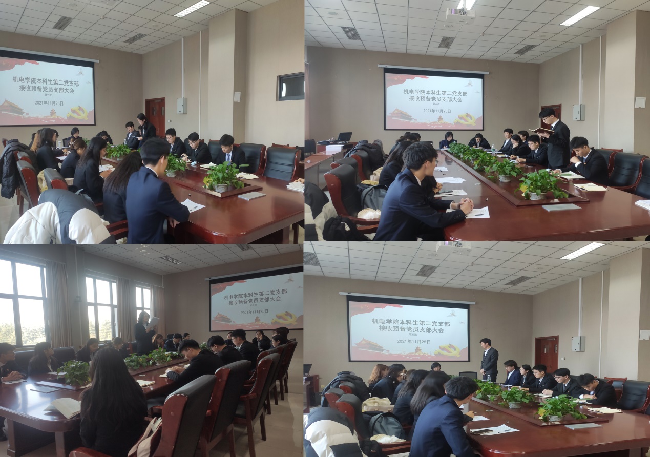 本科生第二党支部于2021年11月25日,召开了接收预备党员大会。大会分7批共接纳崔腾飞、苏怀威、吴愚心、张双龙、郭志伟、罗清赢、孙久茹、任婧、龙柳妹、刘忠勇、赵皓宇、渠述岚、张越、苏兆兴、聂明旭、刘家豪、吕筠易、周睿、应仕诚、倪佳雪、宗俊熠、周芷玥、张永豪、杜春建、刘宇轩、张蓝水、郭伟华、赵灵瑶、李秋月、吕欣雨、于英丽31名发展对象成为预备党员。本次会议由党支部书记王娟娟主持,应到党员3人,实到3人,请假0人。