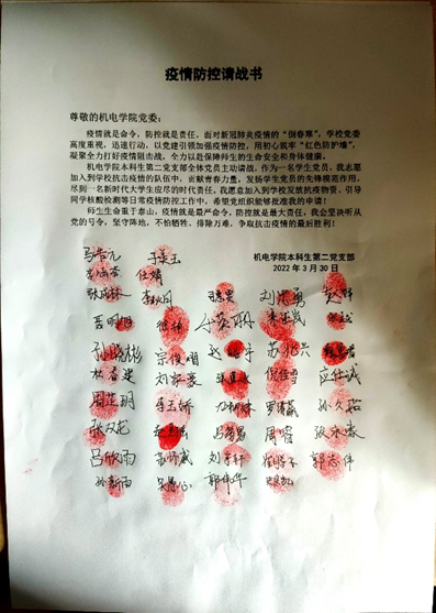 本科生第二党支部全体党员请战,志愿投入到学校的疫情防控工作当中去,为同学们起到表率作用,且在今后的发展中,我们需要时刻保持信念坚定,紧紧的团结在以习近平同志为核心的党中央周围,不忘初心,牢记使命,以实际行动迎接党的二十大胜利召开。