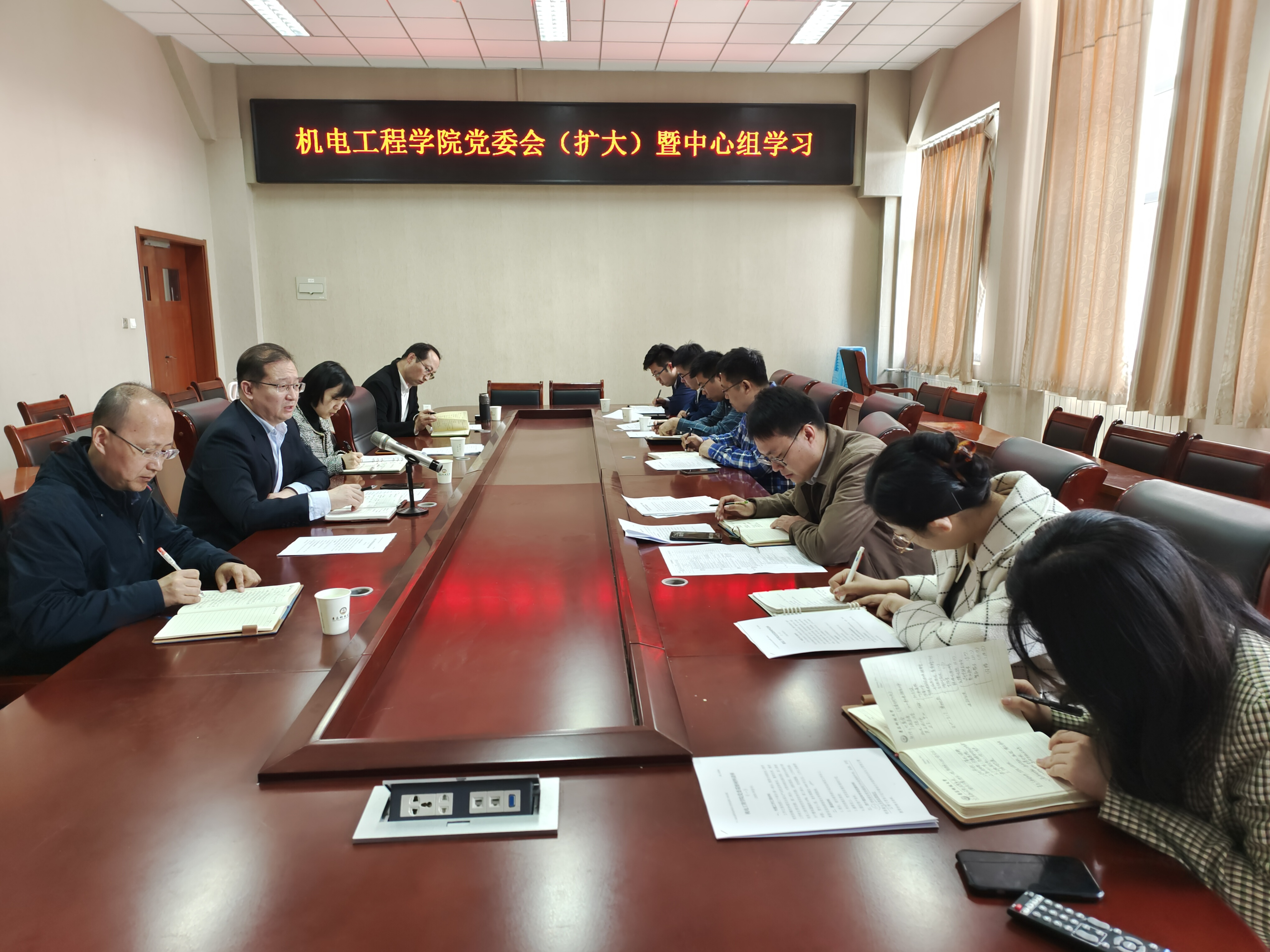 党委在机电楼518会议室召开学院党委理论学习中心组(扩大)学习会传达学习贯彻习近平新时代中国特色社会主义思想主题教育动员部署会精神。学院党委理论学习中心组成员、党支部书记及部分专职辅导员参加会议,会议由学院党委书记任允晓主持。