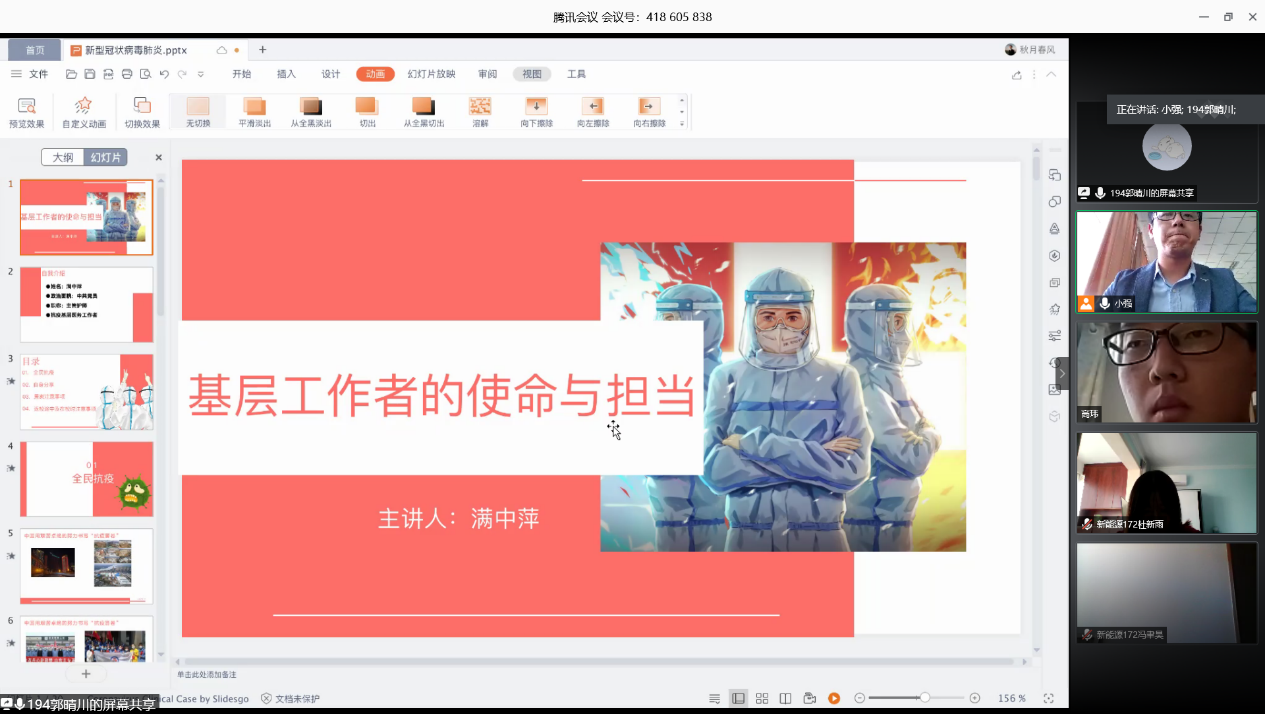 本科生第二党支部召开了“提高防护意识,加强自我保护”的线上座谈会并观看防疫视频,旨在引导广大党员强化纪律意识,学习正确的防疫知识,保护好自己和他人,不断在疫情防控中作出新的更大的贡献。会议邀请了专业医护人员满中萍同志和罗浩宇同学来分享他们在疫情期间的抗疫经历,会议由党支部书记曲智强老师主持,党支部全体成员参加。