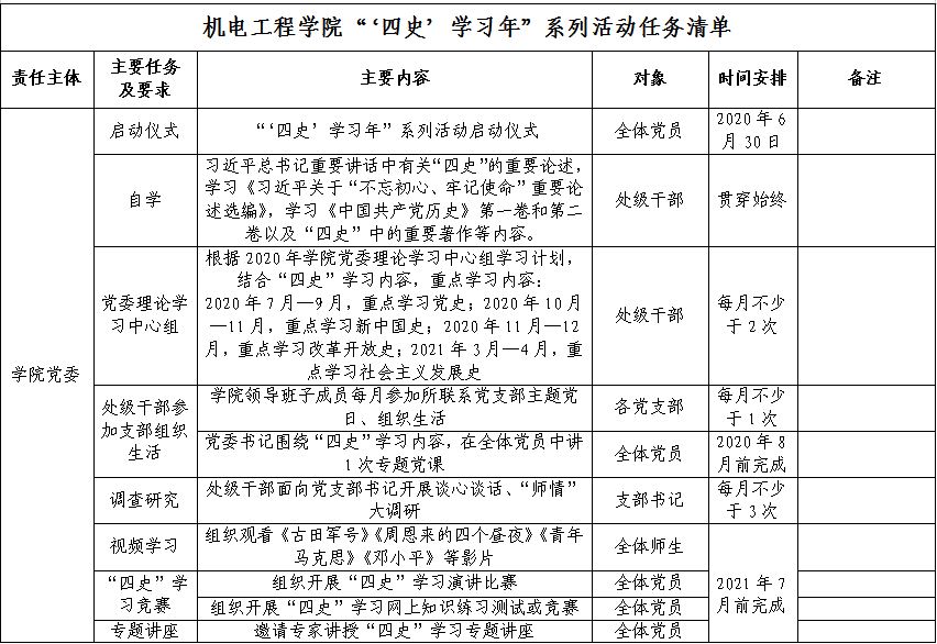 (一)高度重视,精心组织。开展“‘四史’学习年”系列活动既是推进基层党建工作的一项重要内容,也是建立不忘初心、牢记使命长效机制的重要内容,各党支部要切实把系列活动摆上重要位置,精心谋划,及早安排,认真组织。