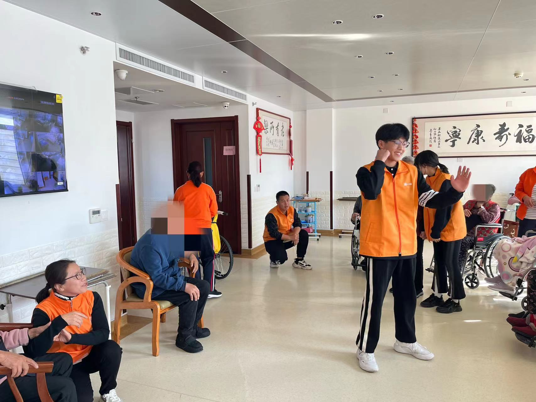 上午8:30,志愿者们准时到达老年公寓,进行签到打卡、领取义工服、阅读义工服务准则并做出准则宣誓。在十方缘负责人的带领下,志愿者们分组进行老人陪伴活动,一对一与老人进行交流和陪伴。活动现场,志愿者们与老人们聊天、做游戏,向老人们进行唱歌、划拳表演。老人们都被大学生志愿者们的热情与温暖感染,脸上洋溢出幸福的笑容,活动现场一派欢乐祥和。