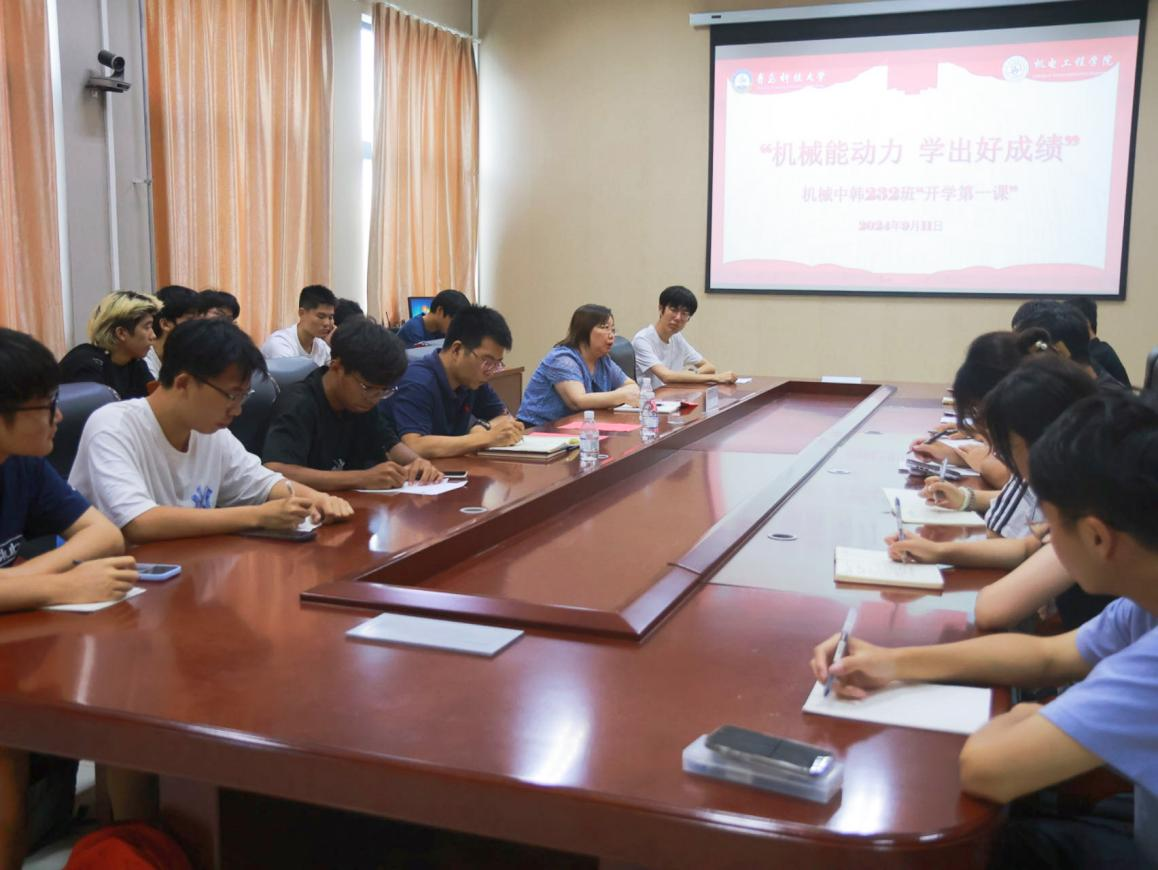 机械中韩232班于在机电楼518会议室召开“机械能动力 学出好成绩”开学第一课主题班会。学院评建办主任付平、辅导员杜康,班级全体同学参加本次班会。