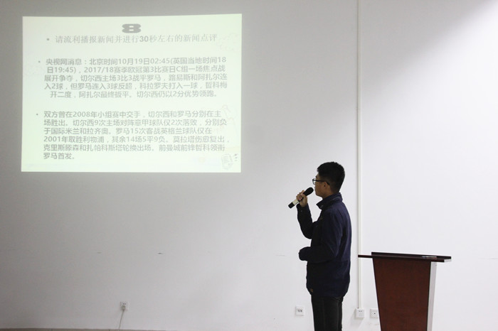 本次比赛包括自我介绍及才艺展示、现场选答和评委点评三个环节。在主持人刘宝忠精彩的开场白下,比赛正式拉开序幕,选手们闪亮登场,他们用自己独特的方式进行自我介绍,各个多才多艺,发挥特长向评委们展现自信的自己。接着,由选手在非凡逻辑、口才考验、情景设置和即兴播报四个类型中根据特长及意愿自行选择并应答,选手们灵活多变,良好的语言表达基础和临场应变能力充分展示出了他们扎实的主持功底。最后,由广播站优秀播音员田依林对选手的表现做了综合评价,充分肯定了部分选手良好的语言表达能力和临场应变能力,表达了对选手们决赛表现的期待并对此次活动的主办方表示了感谢。至此,探花直播