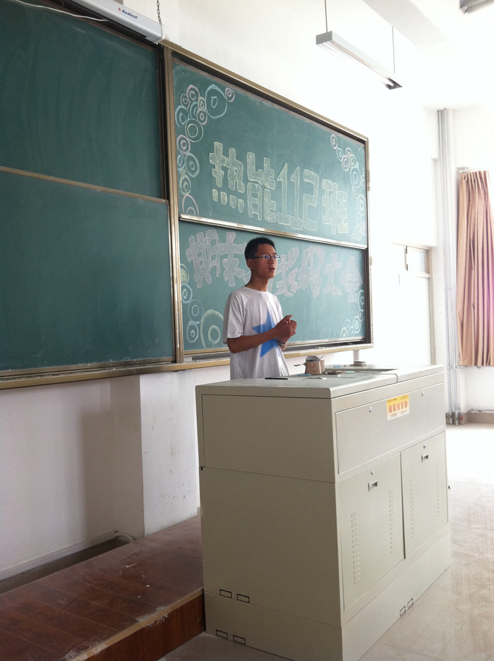 此次班会由班长赵言主持。首先,赵言向大家简单介绍了此次班会的目的和意义。随后,秦洪庆老师结合班级一学年来的表现,勉励同学们积极参与各种活动,认真学好专业知识,做到学习、实践全面发展。结合自己的生活经历与学习经验,引导大家正确对待大学生活,积极参与学习中去。最后向大家讲述了考试的复习方法,强调了考试作弊的严重性,旨在要求大家尽早投入期末复习,严肃对待期末考试。秦老师的讲话精湛透彻,深深的引起了大家的共鸣,让大家明白了如何对待大学生活以及期末考试。赵言对秦老师的讲话做了深刻的总结,要求大家晚上强制性晚自习并减少电脑使用时间,得到了全班同学的一致认可。最后,全班又围绕着夏季班服订制方案进行了热烈的讨论,很多同学在大家面前阐述自己的设计方案,最终通过决议表决出夏季班服的最终方案,主题班会在大家的热烈氛围中圆满结束。