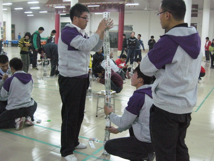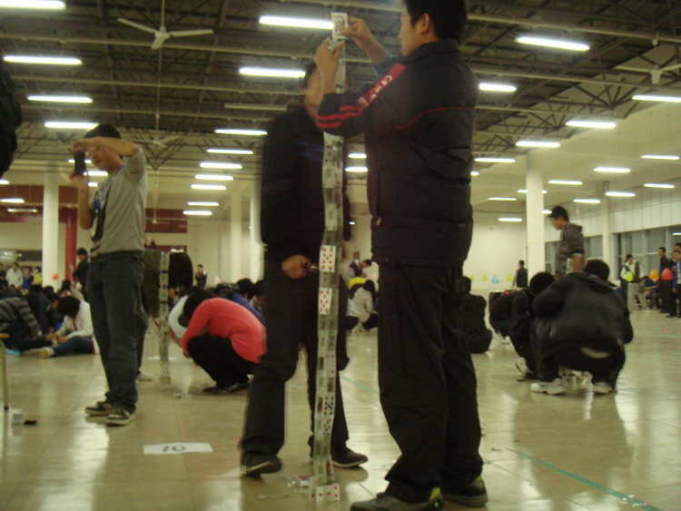 比赛采取两人一组,在20分钟内,用一副普通的扑克牌搭出一座高塔,可以借助剪刀,但要保证扑克牌的完整性,以塔的高度为基本评判标准,塔搭完后要求五分钟之内不能倒。比赛在文艺部的精彩舞蹈下开始,选手们各个有备而来,各队队员分工明确,配合默契,充分运用了力学平衡原理和空间结构原理,将纸牌一张张叠加起来,短短几分钟时间,一座座逼真的高塔便拔地而起。同学们的表情不尽相同,有的满脸洋溢着喜悦之情,有的却眉头紧锁,但更多的是谨慎与仔细。真是一场耐心、细心、团结与想象力的综合比赛!经过激烈的比赛,来自高机111班代表队以192cm获得一等奖,与会的评委为获奖的同学颁发证书和奖品。最后,比赛在精彩的扑克牌魔术表演中落下帷幕。