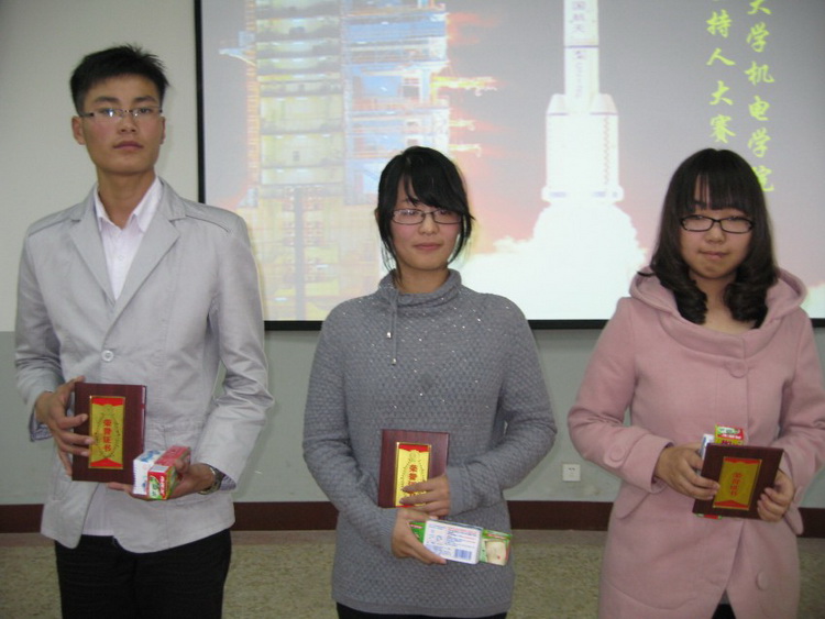 经过初赛的选拔,共有12名同学进入今天的决赛。决赛分为自我介绍和现场模拟、现场提问三个环节。现场模拟环节中,各参赛选手针对“神舟八号和天宫一号成功对接的庆功会”的主题展开主持,选手们的表现都各具特色和风格,现场活动气氛十分浓厚,来自高机专业的孙秀彩同学更是表现脱俗,表现出深厚的主持天赋,展示了作为一个主持人所应该具备的语言素质和应变能力,精彩的主持博得在场观众的热烈掌声。最后评委进行了现场提问,虽然评委的问题有些难度,但很多参赛者都能沉着应对,此环节主要考察了选手们的应变能力。最终经过激烈的角逐,孙秀彩获得一等奖;蒋炎辰,王佳旭获得二等奖;王玉洁,李高林,蒋雪晨获得三等奖。与会评委为获奖同学颁发证书和奖品,并合影留念。