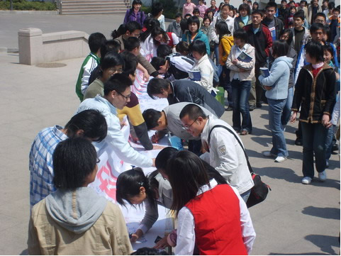 4月9日中午,探花直播 在东部校区餐厅东门举行了大型横幅签名活动。这次活动旨在号召科大师生以饱满的热情积极配合学校做好评估工作,自觉参与评估有关的各项活动。