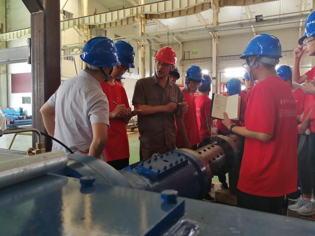 经简单休整后,实践团成员冒着酷暑,按照生产安全参观要求,在孙总的带领下深入生产制造中心的车间,实际参观学习流水线操作。在高温下的车间,实践团成员认真听取孙总的讲解,从图纸到实物,从整体到细节,孙总对挤出机进行了详细的讲解;同时,随行的高机教研室焦冬梅老师、李红艳老师也在现场一一解答着同学们提出的问题。