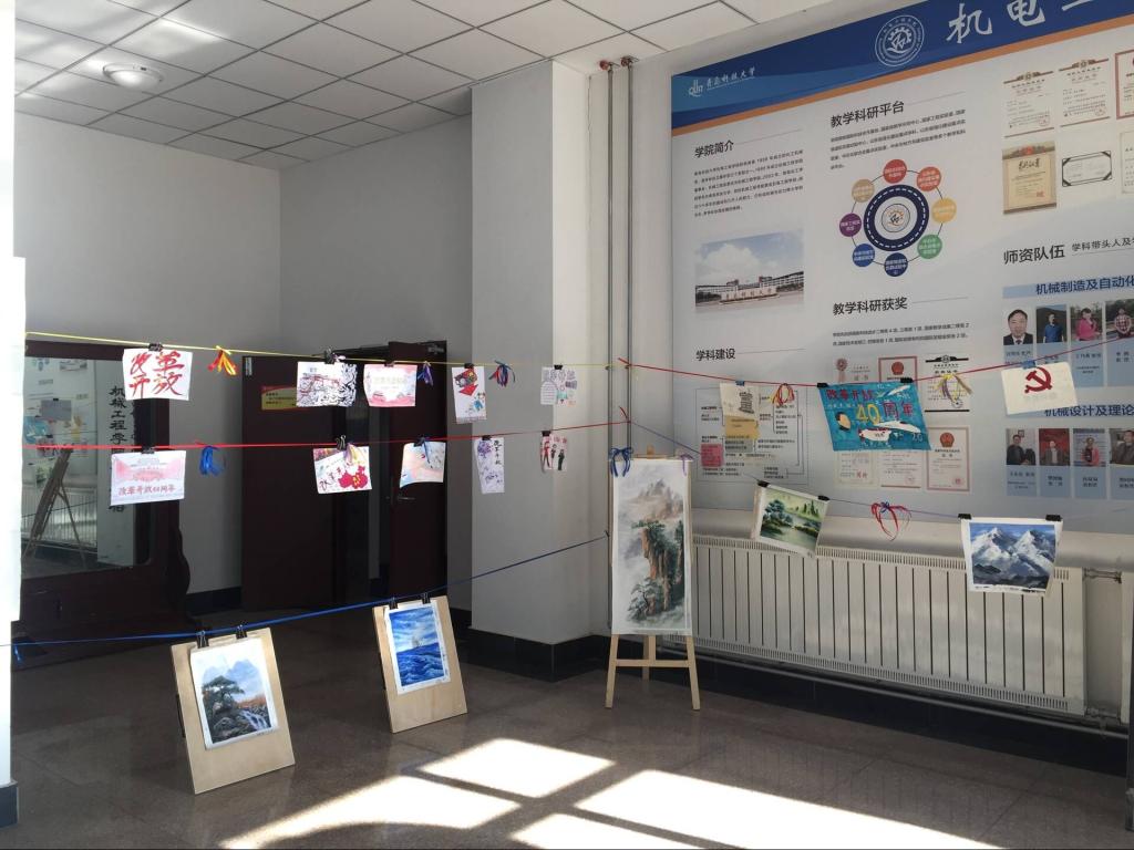 分团委主办,工业设计181班承办的庆祝改革开放四十周年专题书画作品展在机电楼大厅举行。