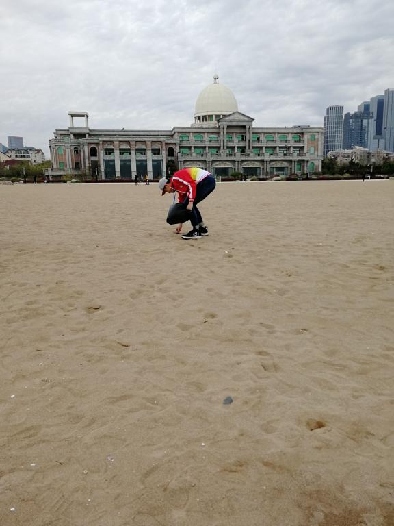 活动当天,碧海蓝天,清风拂过,在游人如织的沙滩上,志愿者们不怕脏,不怕累,身穿红色的院服,手拿垃圾袋,二至三人一组,对沙滩上的烟头、塑料袋、玻璃、石头等不可降解的垃圾和危险废弃物进行地毯式的搜索。经过一个小时的认真清理,同学们收获了满满的“战利品”,石老人的海滩也焕然一新,再次呈现出干净整洁的海岸风光。