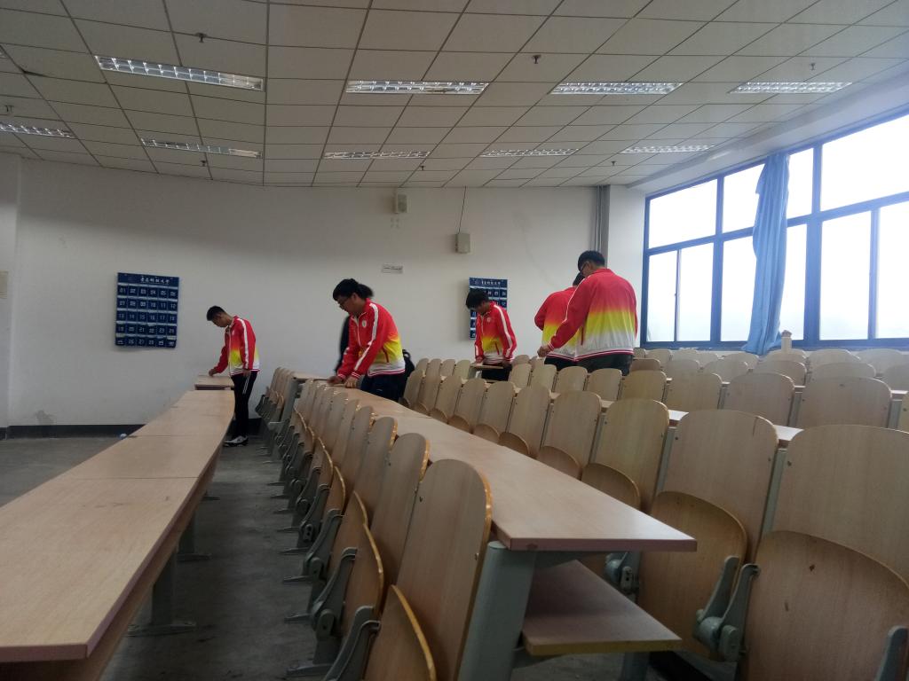 社管委志工部发起的班级义工活动第二期正式开始。微尘志愿者协会部分干事带领高机181班和高机183班的部分同学来到明德楼,开展课桌清理活动。