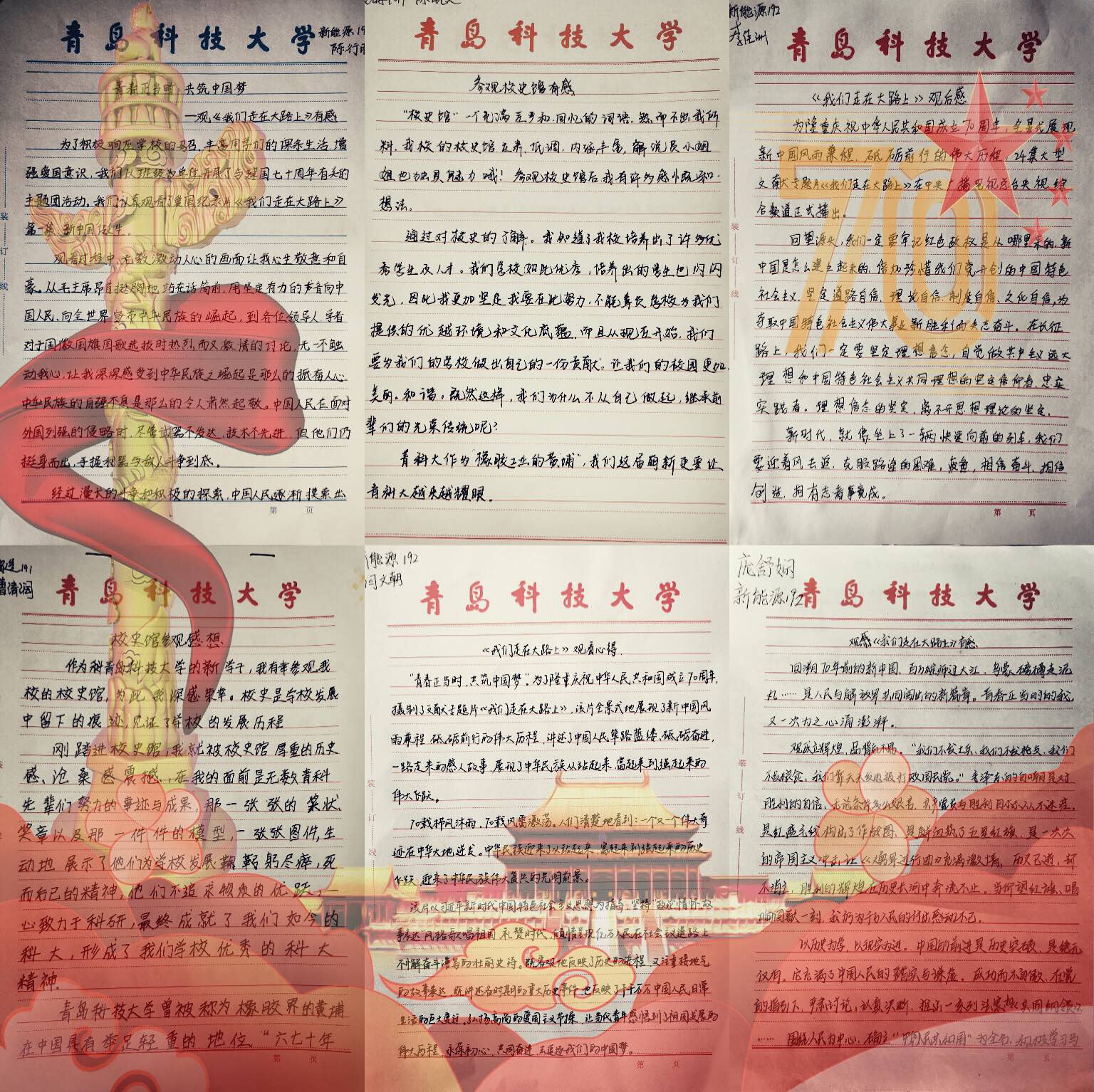 少年强,则国强,用青春的礼赞致敬伟大的中国。10个团支部开展征集爱国感言,提升爱国爱院情怀,感受祖国辉煌70载沧桑巨变。“你给了我生命,在你博大的胸怀里成长。”“无论我走到哪里,你都是我心中最美的歌。”“以我平凡平常的贡献,为祖国强大添一缕光芒!”同学们用最真挚的言语向祖国致敬。