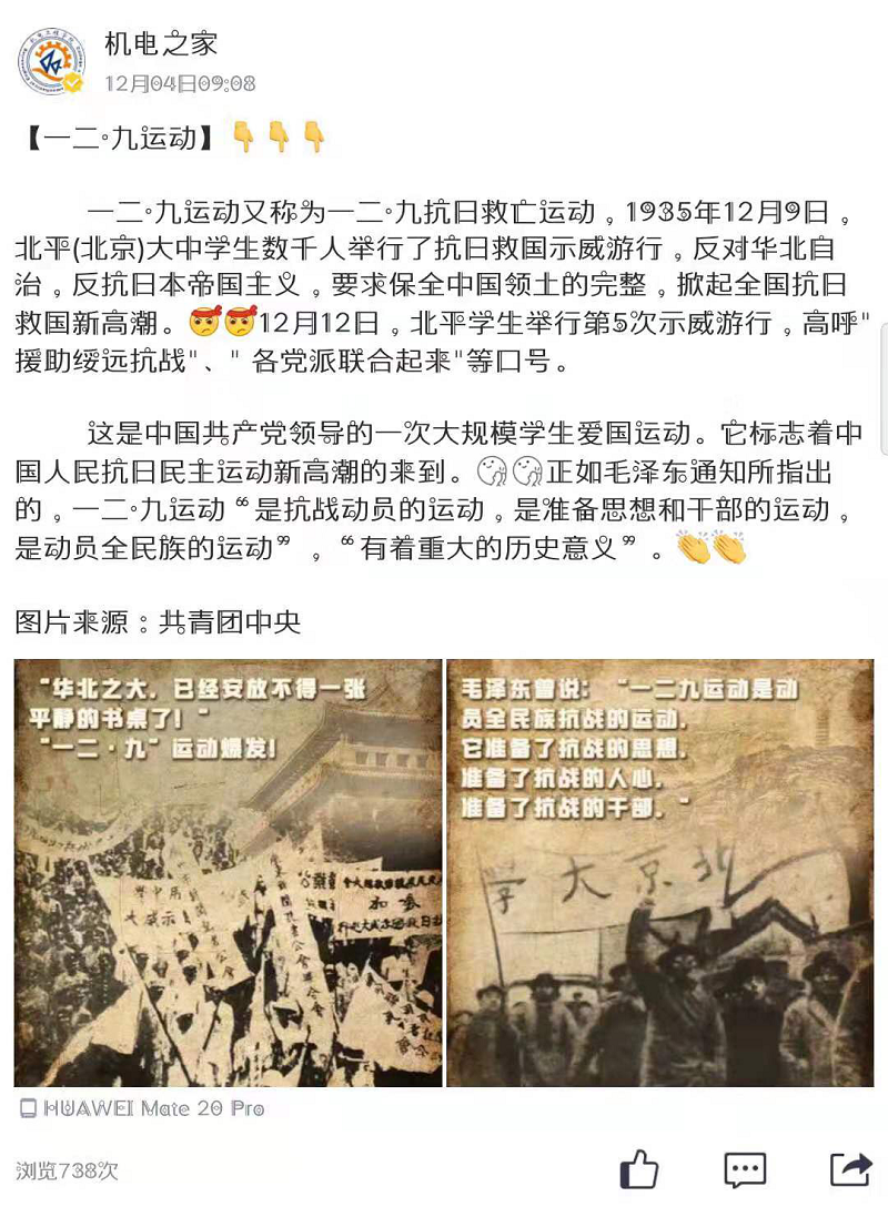学生会自媒体平台“机电之家”发表关于129运动的介绍之外,探花直播