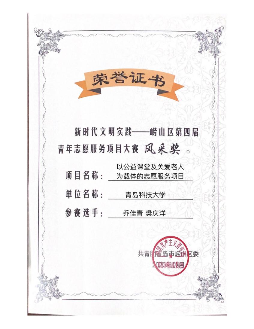 团委志工部部长胡福超老师带领学生代表乔佳青、樊庆洋,积极参与、认真准备,青尘义工队“以公益课堂及关爱老人为载体的志愿服务项目”经作品申报、资格筛选、项目展示、评审打分等环节,最终获得大赛风采奖。