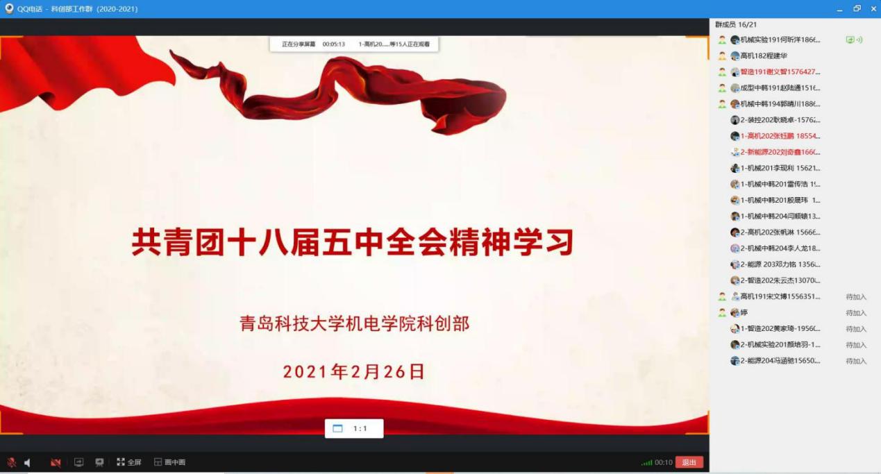积极开展,遍地开花。自活动开展以来,各团支部通过云端主题团日活动、线上学习交流会、“微团课”等多样形式积极引导团员们广泛深入讨论探讨共青团十八届五中全会精神及其内涵,得到了显著的效果。