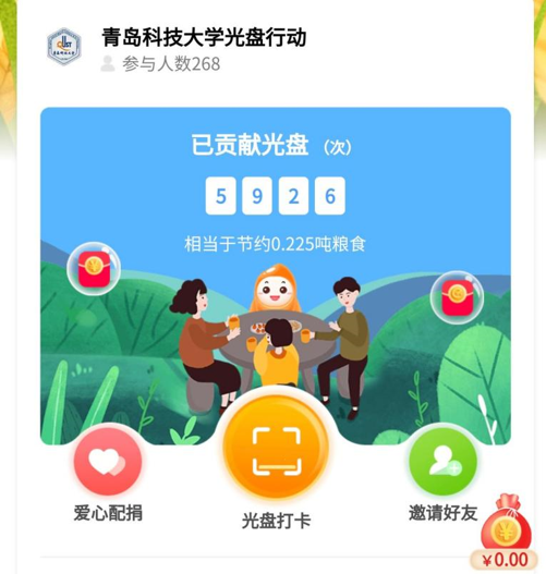 自2021年10月16日推出“光盘行动,你我同行一一30天打卡活动”以来,至今已近半月,实现“光盘打卡”5926次,相当于节约了约0.225吨粮食。此次活动积极响应了在本次世界粮食日,联合国粮食及农业组织的呼吁:政府、国际组织、高校等社会各界需凝聚共识,采取行动,改变世界粮食生产和消费方式。