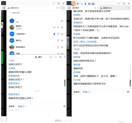 会议最后,学院设置了互动回答环节,家长们热情高涨、积极提问,三位辅导员老师对家长的提问进行了详细解答,此次云家长会在轻松热烈的氛围中圆满结束。