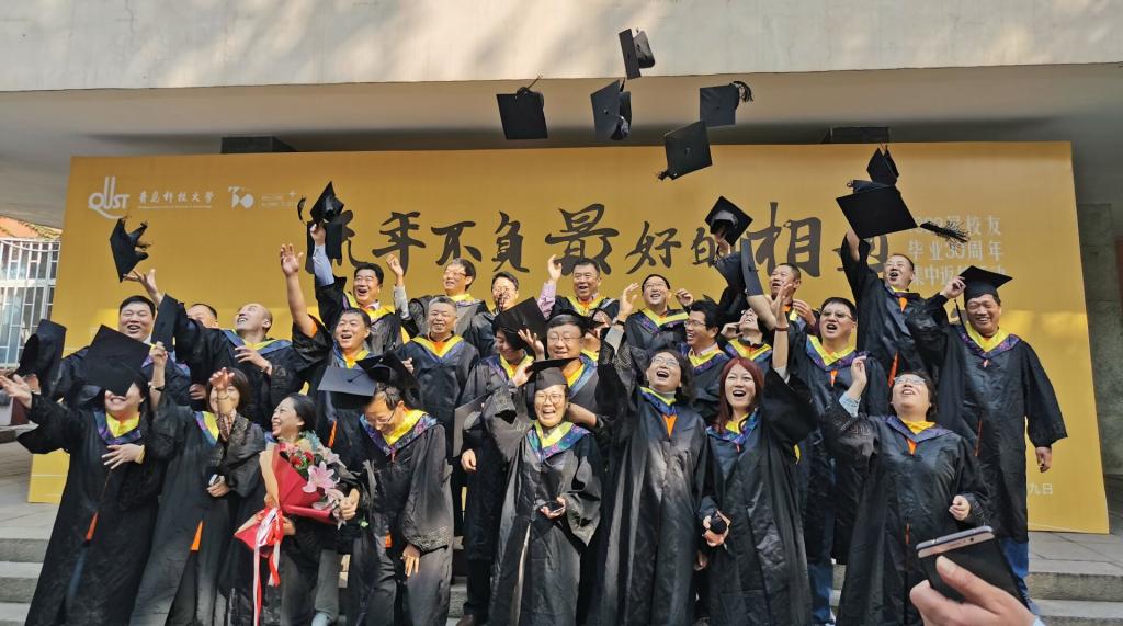 活动中,校友们怀着感恩与思念的心情,回到阔别30年之久的母校,与久未谋面的老师、同学们共叙当年同窗之情。活动现场精心设计了以“流年不负最好的相遇,是久别重逢”为主题的彩色喷绘板,同时学院还为校友们准备了精美的纪念品——内含校友宣传视频的优盘等等,大家穿上学士服,与到场的同学们一同拍照留念。