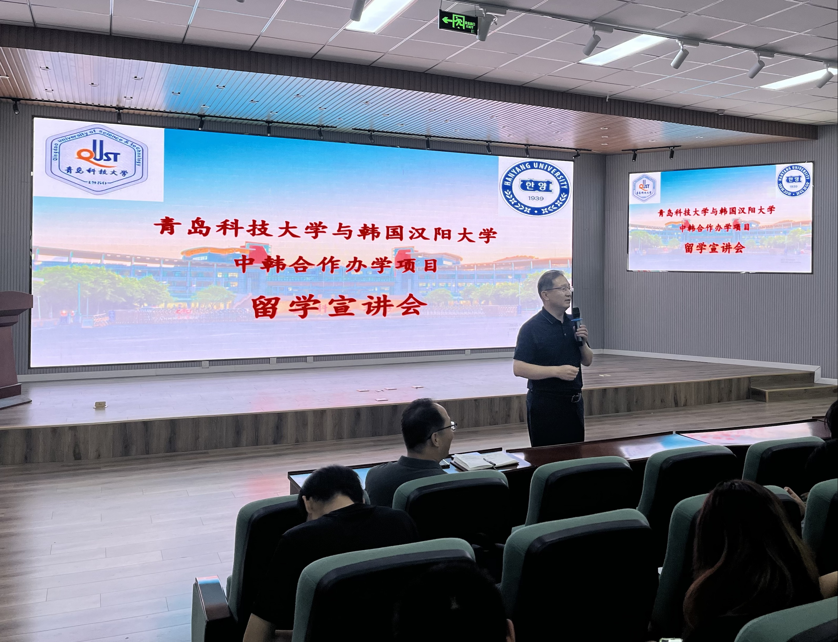 6月27日下午,探花直播 与韩国汉阳大学中韩合作办学项目留学宣讲会在崂山校区机电楼530会议室召开。学院党委书记任允晓、副院长李剑光、项目负责人林奕出席了会议。