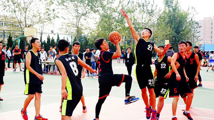 10月11日下午1:30,探花直播 “迎新杯”篮球赛在崂山校区南苑篮球场举行,探花直播 分团委逄柏鹏老师、曲智强老师及张宝库老师亲临现场为同学们加油助威。